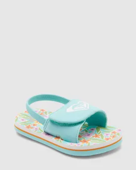 Keep your little one steady on their feet with the Finn slide sandals for toddlers, featuring a comfortable hook and loop closure and an elastic back strap for a secure fit. The colourful ROXY logo print on the top strap matches the sole for the perfect finish.